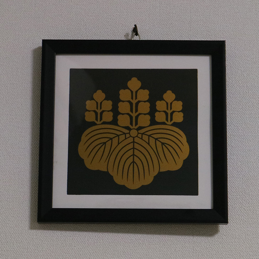 豊臣家(豊臣秀吉)の家紋である五七桐(ごしちのきり)を自立できるフレームにおさめた家紋額です。小ぶり軽量な樹脂製フレームなのでインテリアとして、コレクションアイテムとして場所を選ばず飾ることができます。