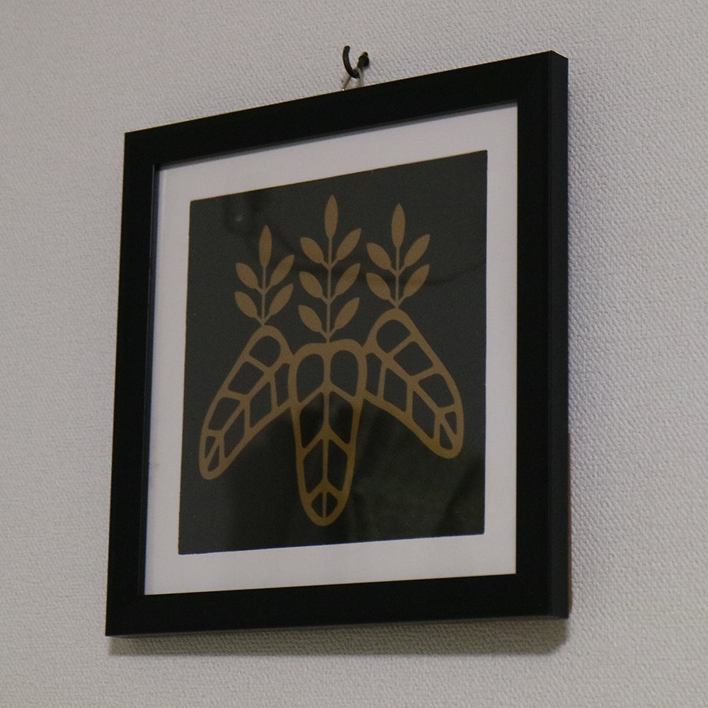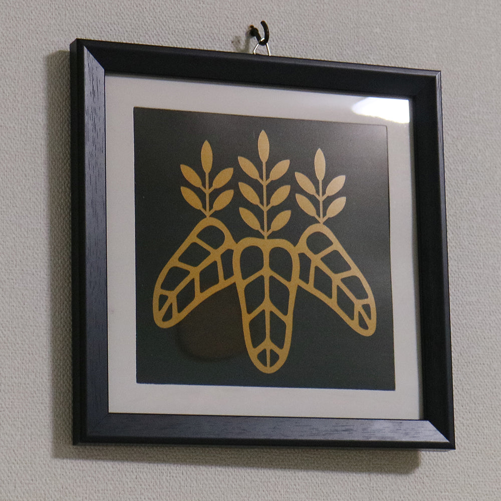 豊臣秀吉が天下統一の後に自らが作った家紋である太閤桐(たいこうぎり)を自立できるフレームにおさめた家紋額です。小ぶり軽量な樹脂製フレームなのでインテリアとして、コレクションアイテムとして場所を選ばず飾ることができます。