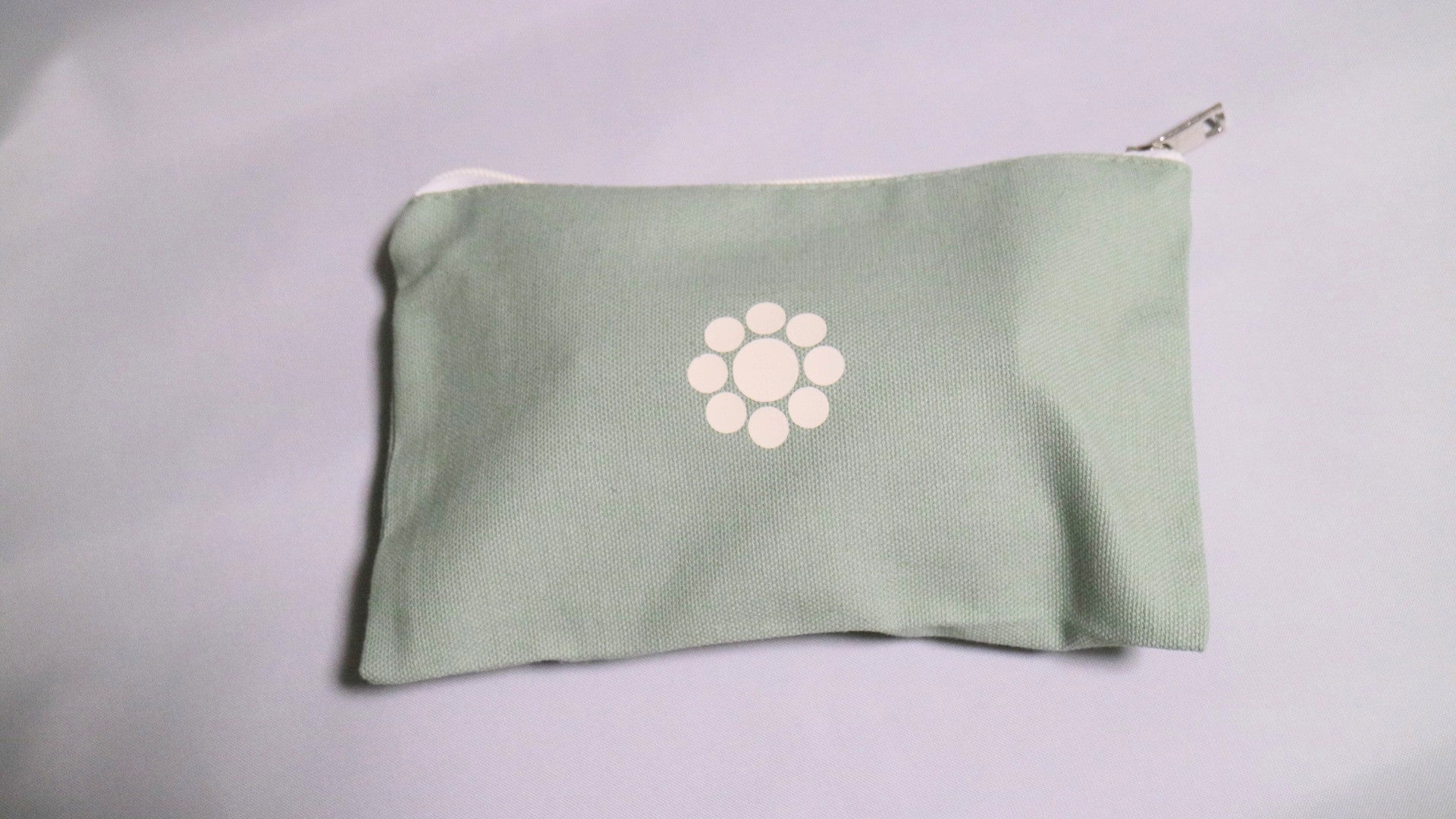 薄めの緑色のポーチにアイボリー色でプリントされた家紋がかわいらしいポーチです。