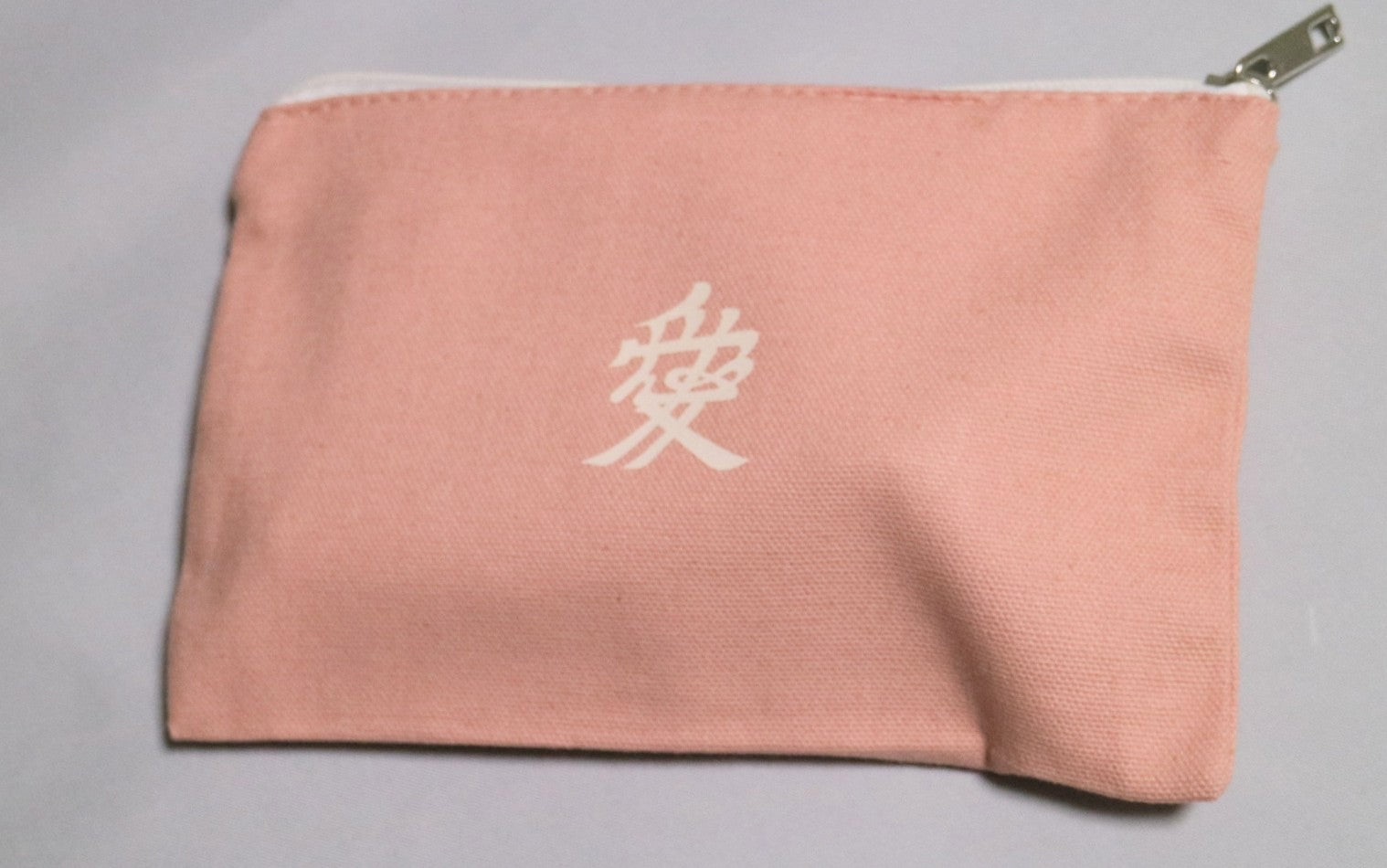 薄めのピンク色のポーチにアイボリー色でプリントされた愛の文字がかわいらしいポーチです。